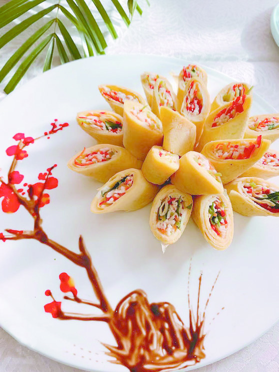 王國旗推介的山藥做法有:攤好雞蛋皮,裹上山藥絲、蘿卜絲,一共七種顏色,名叫麗花山藥;蔬菜皮和雞蛋皮裹上山藥,精致可口,起名為壽司山藥;紫薯和山藥打拌成泥,再澆上藍莓汁,經過精心的擺盤后就是山水山藥。