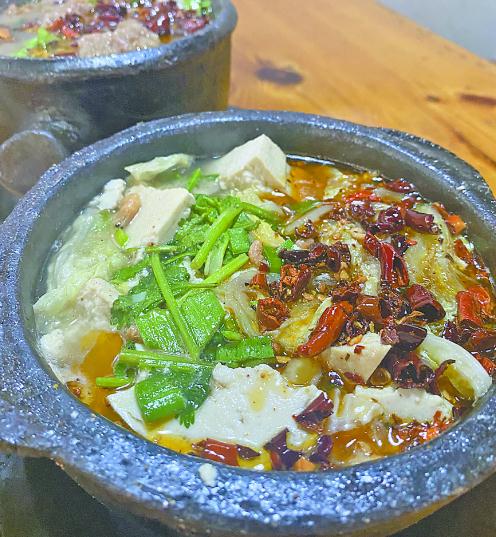 武陟砂鍋,傳承千年。制作時,先將肉類食材熱鍋清水斷生、去異味,然后放入盛有清水的砂鍋內,旺火燒開,再用小火慢慢煨煮,湯味濃厚,肉質酥嫩香爛。最令人驚艷的是,武陟砂鍋端上餐桌后,服務員會端著一勺剛炸好的紅辣椒油倒入砂鍋,“刺啦”一聲,刺激食客們的味蕾。