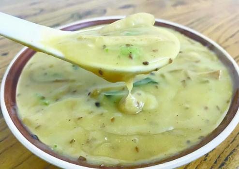 記者在現場看到,剛做好的豆沫呈半透明的乳黃色,內有芝麻、青菜、花生、黃豆、粉條等,用鼻子一聞,醇厚的小米香,伴著豆香、芝麻香、花生香和蔬菜的清香融為一體,濃郁撲鼻。記者忍不住喝了一口豆沫,糊濃稠細膩,配菜香脆嫩滑,咸淡適中,回味綿長,仿佛飲一壺醉人的美酒,滿嘴留香,讓人回味無窮。