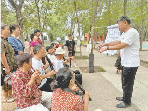 秋日午后的市人民公園,微風拂過樹梢,灑下斑駁的光影,真一個秋高氣爽的好時節。時間剛過16時,樹蔭下的空地上漸漸熱鬧起來,數十位銀發老人陸續聚攏,自發站成整齊的兩排。電子管的悠揚旋律率先響起,緊接著,二胡渾厚的音色、笛子清亮的曲調交織在一起,緩緩縈繞在公園的每個角落。一位精神矍鑠的老者走到隊伍前方的指揮位置,深吸一口氣后,手臂隨著音樂聲有力揚起,“五星紅旗迎風飄揚,勝利歌聲多么響亮……”大家齊聲合唱,歌聲瞬間打破了午后的寧靜。