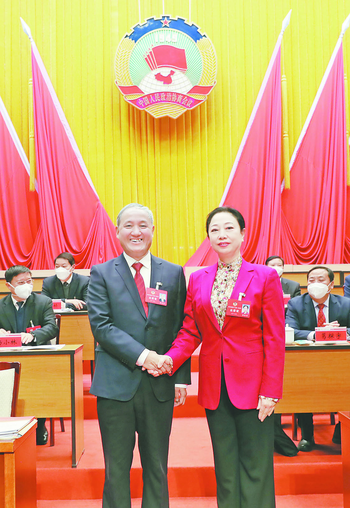 市委書記葛巧紅與新當選的政協第十五屆焦作市委員會主席宮松奇握手表示祝賀。