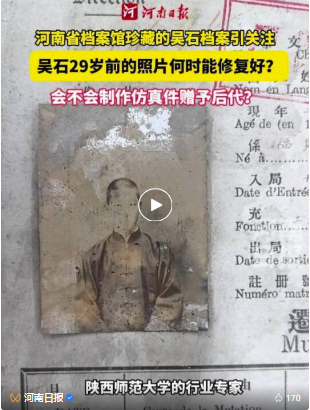 12月16日,河南省檔案館發布消息稱,完成了對珍貴照片的修復保護。吳石烈士眼神、表情、衣服、衣扣等細節得以還原,其青年時期的堅定剛毅形象得以重現。