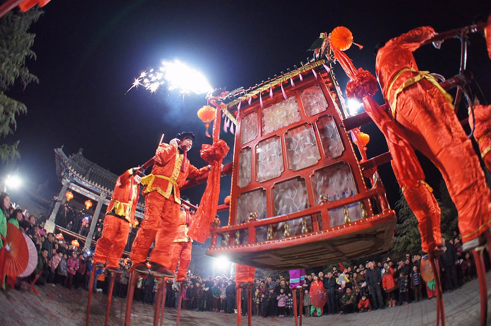 焦作沁陽市山王莊鎮(zhèn)萬南村的大型民間集體舞蹈藝術(shù)“高抬火轎”起源于宋代,明末清初得到發(fā)展。當(dāng)?shù)鼐用褡怨乓詠砭陀胁雀哕E、抬花轎鬧新春的習(xí)俗。明萬歷年間,大科學(xué)家和藝術(shù)家、明鄭藩王子朱載堉把踩高蹺和抬花轎兩種民間表演藝術(shù)結(jié)合在一起,設(shè)計(jì)出了踩著高蹺抬花轎的表演形式。隨后,朱載堉不斷對(duì)其進(jìn)行改進(jìn),將白天表演改為夜間表演,將花轎改為火轎,把原來的布轎改為紗轎,轎的周圍插上蠟燭,轎頂鑲嵌著能噴射彩色火焰的龍頭,寓意火旺、財(cái)旺,象征著一年里百姓生活紅紅火火。