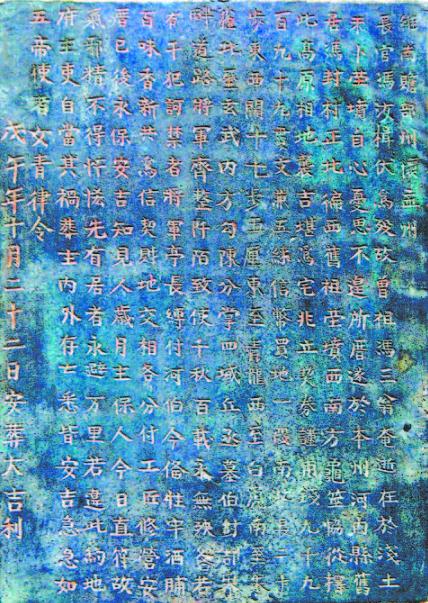 銅質的買地券十分罕見。該買地券長32厘米、寬23厘米、厚1.5厘米,券面鐫有楷書文字16行,共290字,文字工整清晰,主要記錄了墓主人馮汝楫官場發跡后,為其父親、祖父另選安葬地址的事情。