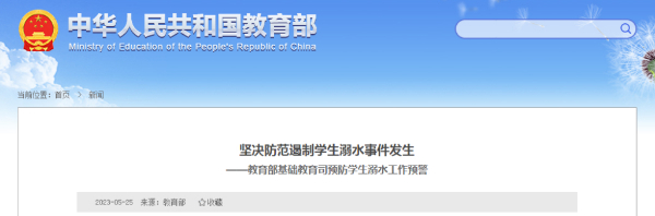 近期,全國各地氣溫迅速回升,汛期即將來臨,溺水事故進入高發期。為切實保障學生生命安全,教育部基礎教育司5月25日發布預防學生溺水工作預警,提醒各地要以農村地區學校、村莊周邊和學生上下學沿途水域為重點,全面排查安全隱患,完善安全警示標識,配置安全防護設施。