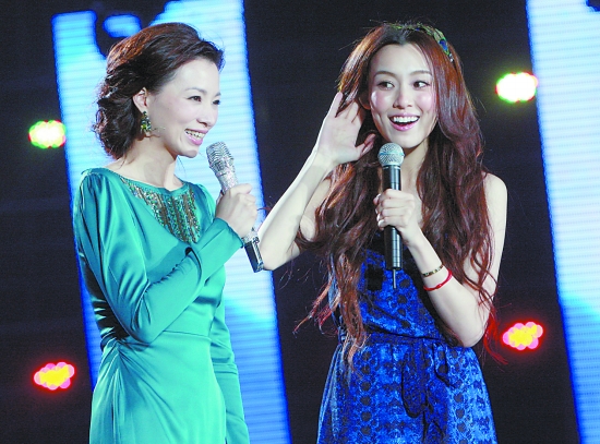 | 中央電視臺著名主持人董卿和著名歌星范瑋琪在文藝晚會上。 劉 璐 攝 |