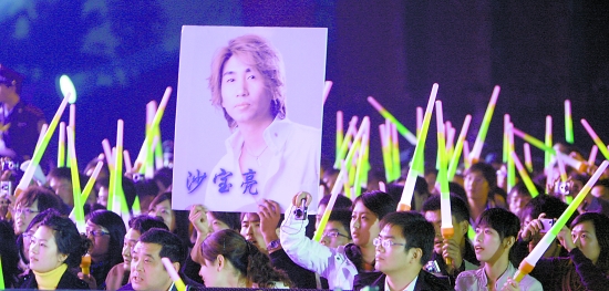 | ↑河南理工大學師生將著名歌星沙寶亮的照片高高舉起。 本報記者 劉 璐 攝 |