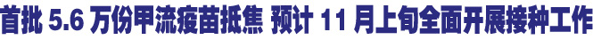 焦作日報訊 (記者付首鵬) 10月29日,記者從市衛生局獲悉,首批5.6萬份甲型H1N1流感疫苗已于本月27日抵達我市,目前,市衛生系統正在對疾控機構、接種機構和接種人員進行疫苗接種前的培訓工作,預計11月上旬,我市將全面開展甲型H1N1流感疫苗的接種工作。