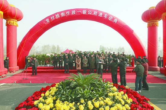 賈書君在講話中指出,經過廣大建設者兩年多的艱苦努力,全市人民注目已久的常付線焦作段一級公路終于建成通車。常付線焦作段一級公路的建成通車,進一步完善了我市干線公路網的結構,必將加快聚集晉東南、豫西北地區的人流、物流和信息流,進而拉動區域經濟的又好又快發展。常付線焦作段一級公路的建成通車為沿線廣大人民群眾鋪就了一條通向美滿、幸福生活的金光大道,對加快我市新農村建設步伐具有重要意義。