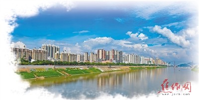 圖① 潯江沿岸高樓連綿,在藍天白云的襯托下,展現出一派宏偉現代都市氣息。