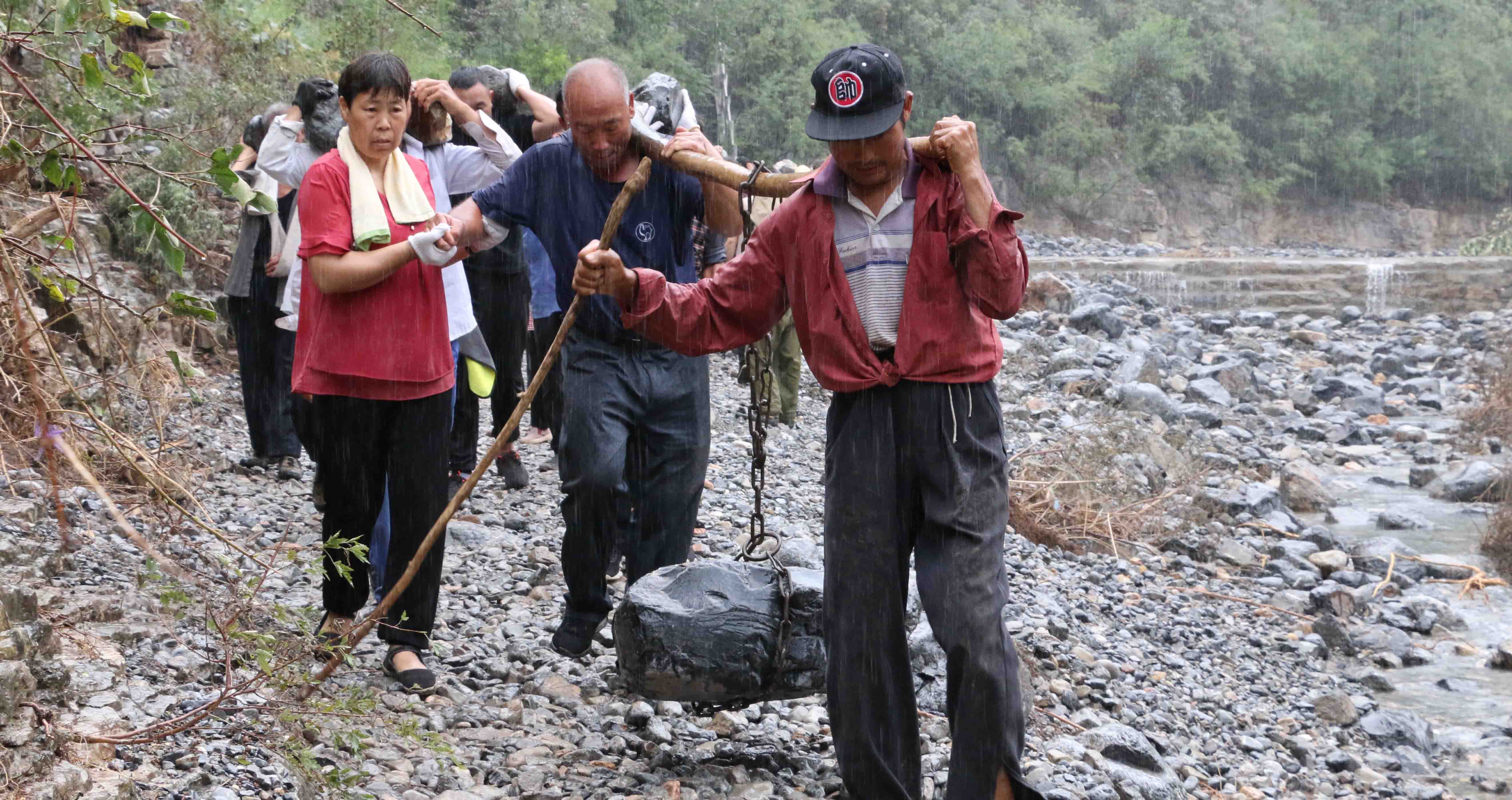 自7月25日開始,青天河村和碗窯河村之間狹小的山路上,出現了頗為壯觀的景象:幾十名平均年齡超過65歲的老人肩挑背扛著石頭、中年人拉沙、孩子們搬著小石頭,有條不紊地堆砌河道旁的道路。
