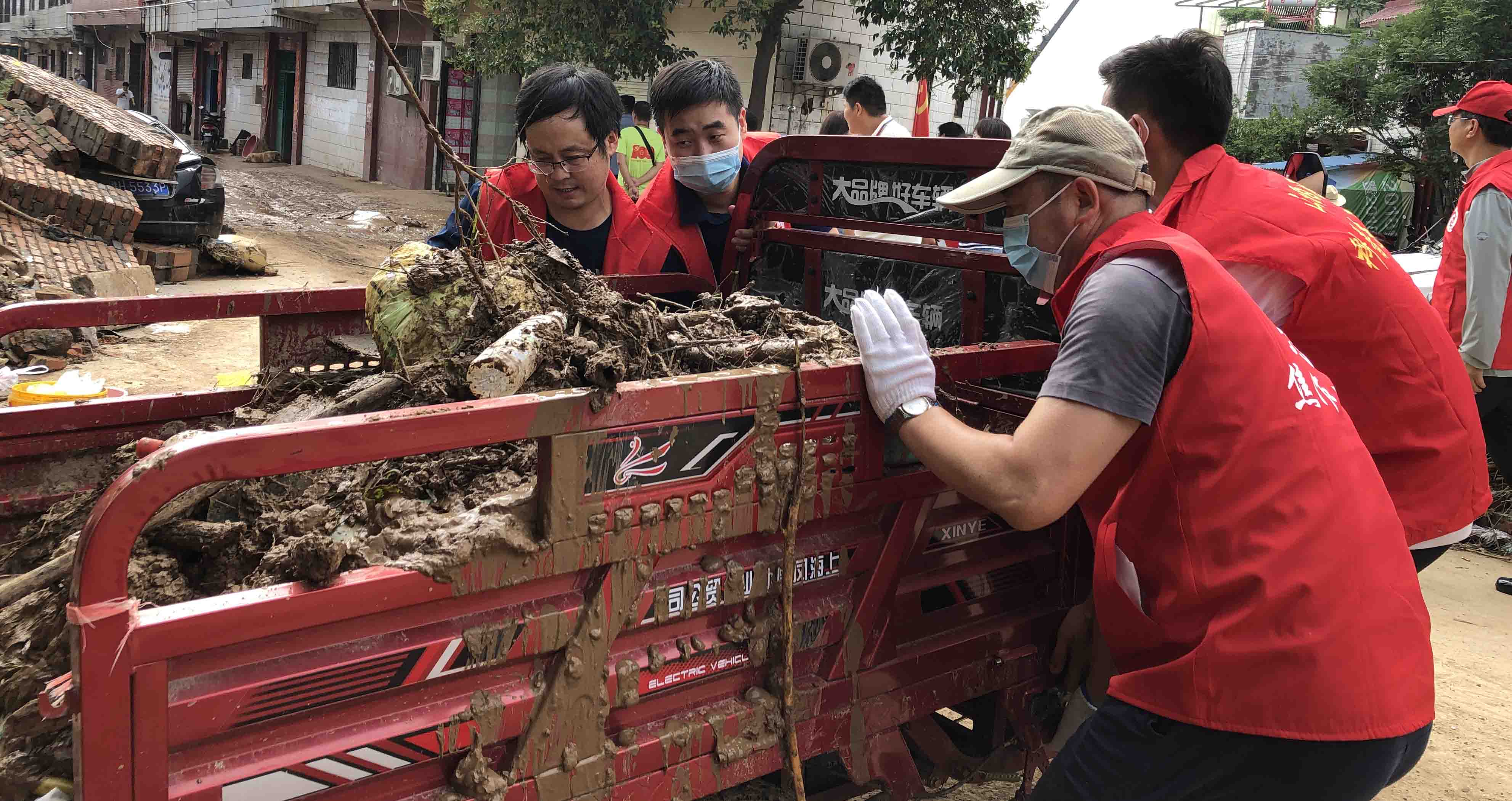 在完成本校清淤消殺任務外,焦作一中還派出黨員志愿者奔赴受災較重的光亞新村開展清淤清掃工作,幫助居民重建家園。光亞新村正好位于甕澗河泄洪口,居民房屋多處進水,街道上到處都是污泥、垃圾、樹枝和建筑殘骸,居民出行困難。該校黨員志愿者趕到后,發揚不怕苦、不怕累的精神,站在污泥中把散發臭味的垃圾裝車運走,他們不顧泥點飛濺、不顧汗流浹背,一心只想讓居民的生活環境更健康。經過近4個小時的努力,光亞新村街道上的垃圾、淤泥和積水基本清理干凈。