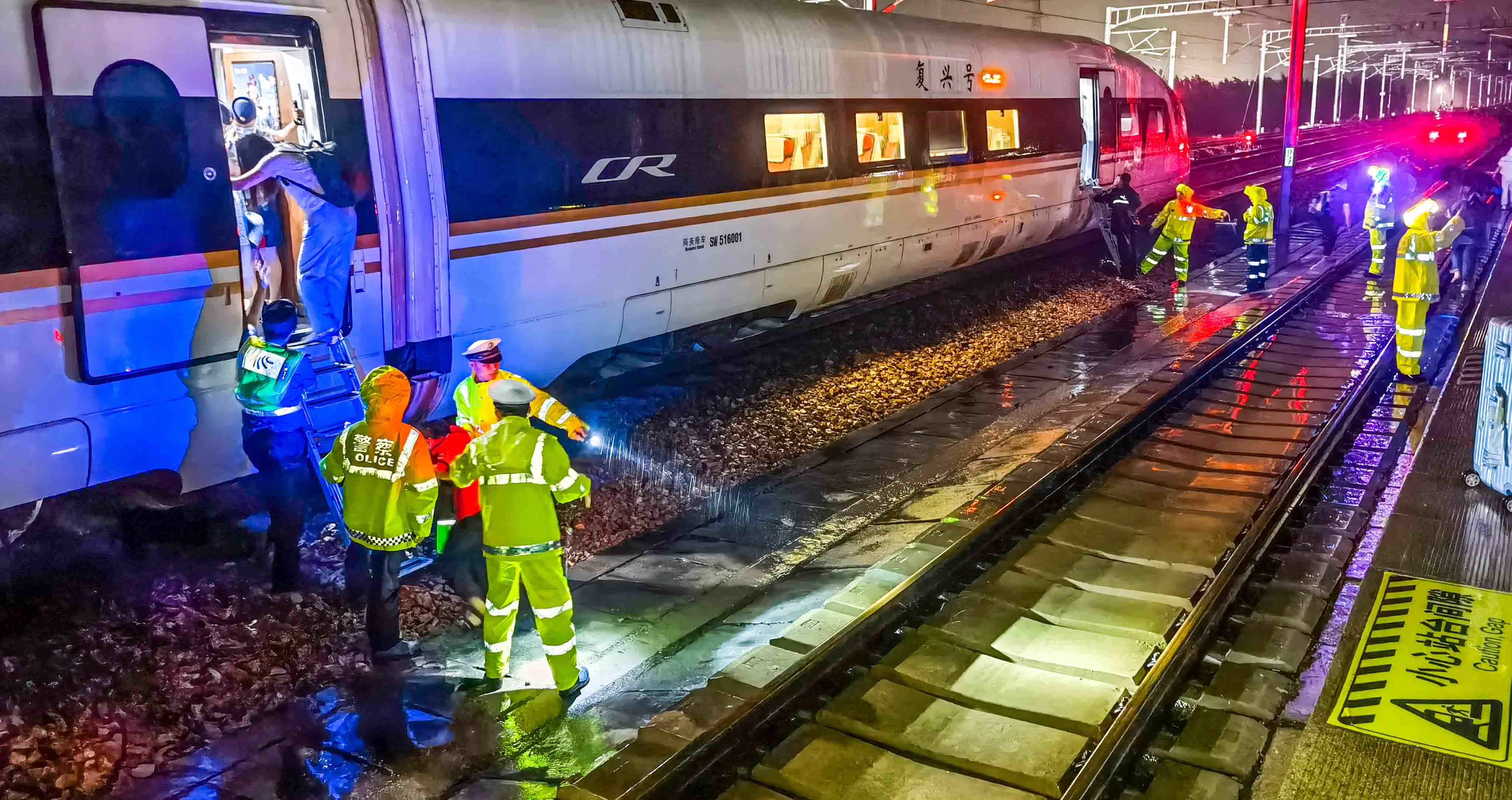 按照部署,民警立刻行動。為了安全,車廂只打開了兩個出口,民警分布周邊,一邊安撫乘客情緒,一邊照顧大家有序下車。攙扶老人、抱著孩子、扛起行李……雨中,民警的真情救助溫暖了乘客的心。