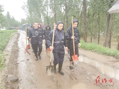 7月21日,修武縣司法局干警在大沙河加固河堤。
