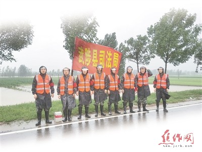 暴雨肆虐,沁河大堤上武陟縣司法局的防汛干警們的腳步一刻沒有停歇。面對嚴峻的防汛任務,該局組織防汛突擊隊,由班子成員帶隊,組織精干力量,全力配合參與全縣防汛工作。防汛期間,突擊隊分為三個小組全天24小時到分包堤段進行實地巡查,奮戰在防汛第一線。