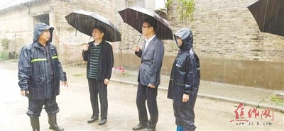 市文廣旅局局長金貴斌(右二)、副局長劉立東(右三)到多個地方檢查指導防汛工作。