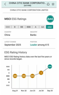 近日,國際權威指數機構明晟(MSCI)發布2025年度中信銀行(601998.SH,00998.HK)環境、社會及管治(ESG)最新評級結果,評級由“A”上調兩級躍升至全球最佳等級“AAA”級。這是繼2024年從“BBB”提升至“A”后,中信銀行MSCI ESG評級連續第二年提升,在全球同業中處于領先(leader)水平。