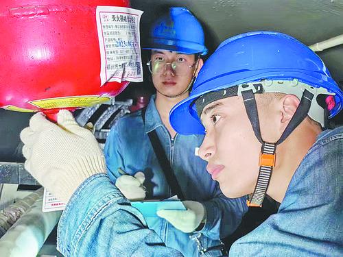 崔樂樂(右)在電纜隧道內檢查滅火設備。本報記者 吉亞南 攝