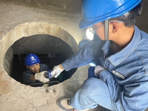 在進入電纜隧道之前,蘇云龍要打開隧道通風井通風。當通風井的門被打開時,一股涼氣從地下躥了上來,讓人不由地打了個激靈。從事配電電纜巡視工作需兩個人同行。當天,蘇云龍和同事崔樂樂搭班,他們相互檢查安全帽、照明手電、檢查儀器等工具后,就要通過豎井進入到電纜隧道了。豎井壁上的爬梯很簡易,記者按照蘇云龍交代的動作要領,手腳并用,終于下到距地面4米深的電纜隧道內。