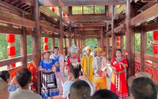 中新網恩施8月21日電 (武一力)“咚鏘、咚鏘、咚咚鏘……”鑼鼓間歇,歌聲即起,近日,一場在湖北省恩施土家族苗族自治州宣恩縣一景區上演的三棒鼓表演吸引游客駐足圍觀。